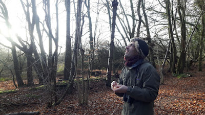 Pushing through Goat Meadow, we unfortunately didn't turn up our trusty Marsh Tits, despite hearing them here regularly. In a clearing next to Lower Picketts Wood, I was distracted by a loudly alarm-calling Fieldfare which I then followed, hoping to spot a bird of prey. While I was busy looking the other way, it was then that Tom F spotted something sitting up proudly on a massive old Hawthorn bush...